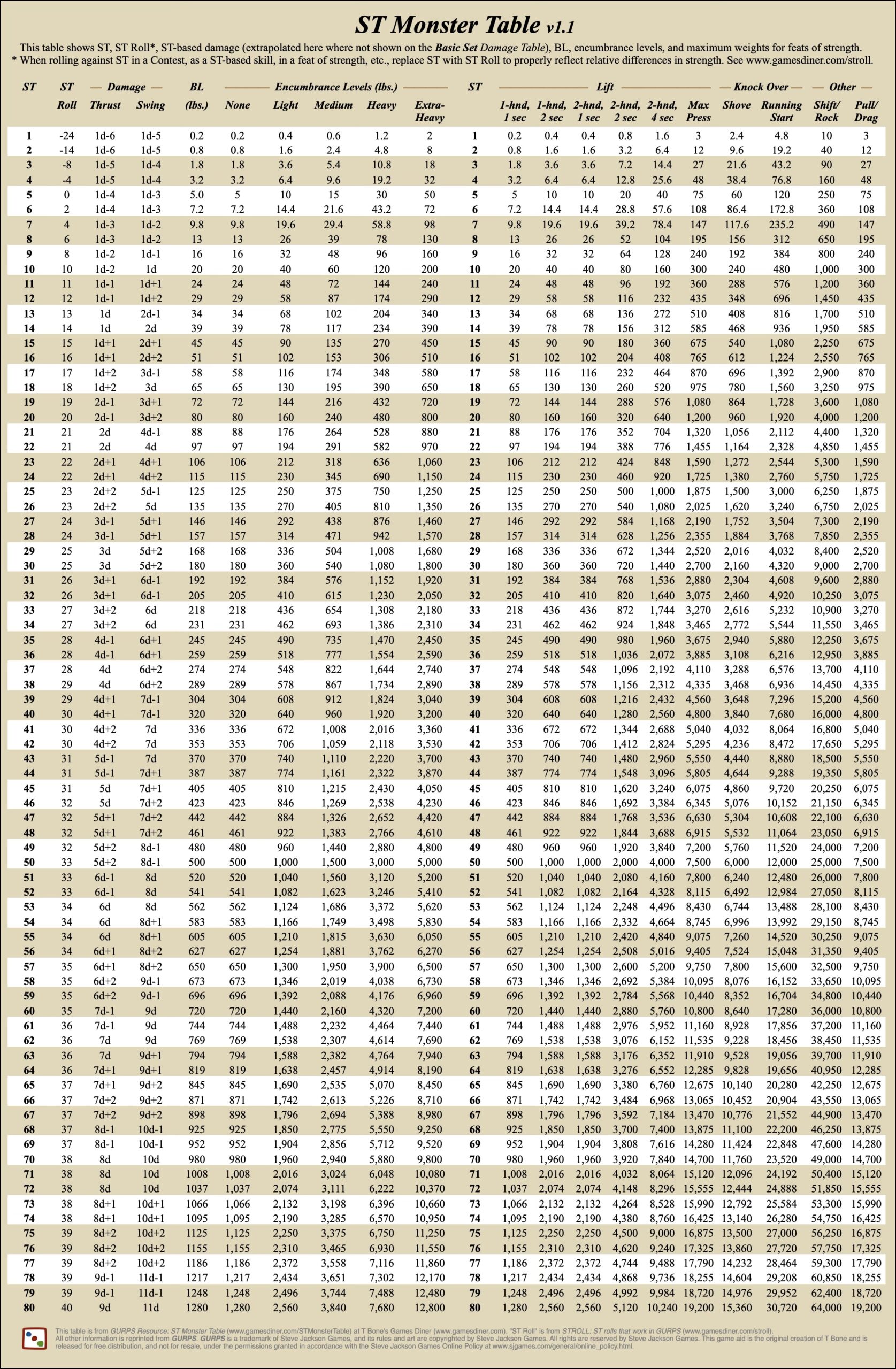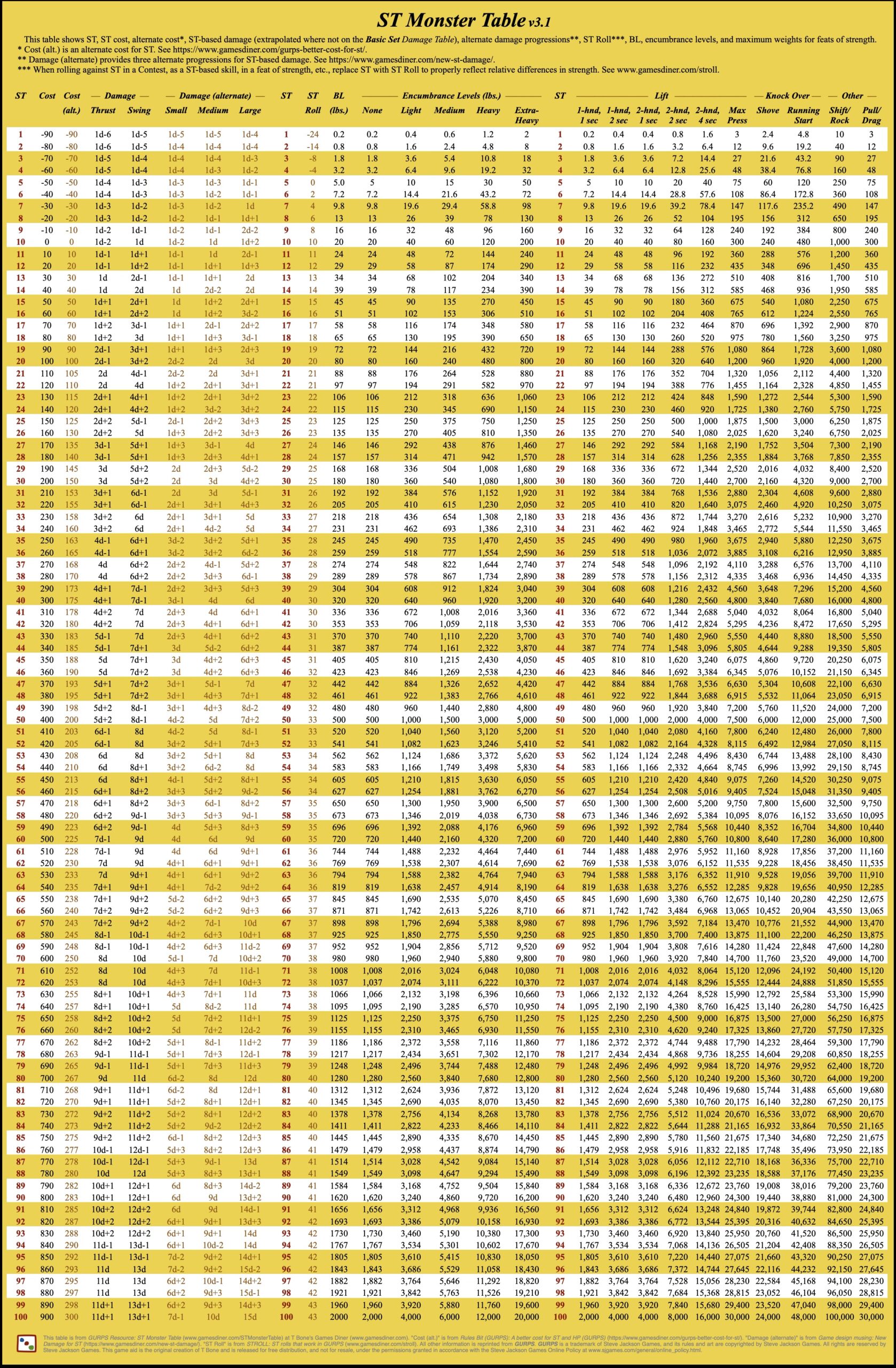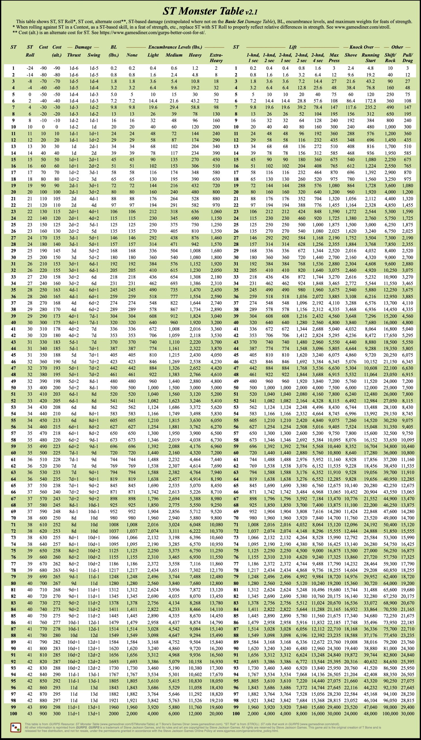 What monstrosity lumbers forth? The ST Monster Table for GURPS! Why has it risen? None can say – or perhaps none dare. Born of a mad notion that the Damage Table and the Basic Lift and Encumbrance Table could be fused into a single heaving entity, this Qabalic construct reveals even damage scores expunged from the Damage Table. For while summoning new tables for STROLL of late, it was discerned that the stars are aligned and the portals are open; now is the time. The time for what? To create that accursed chimera of a table – and to cram it full of everything!